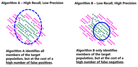 Algorithms generally have to trade-off between recall (the ability of the algorithm to identify all relevant cases) and precision (the percentage of all identified cases that are correct).