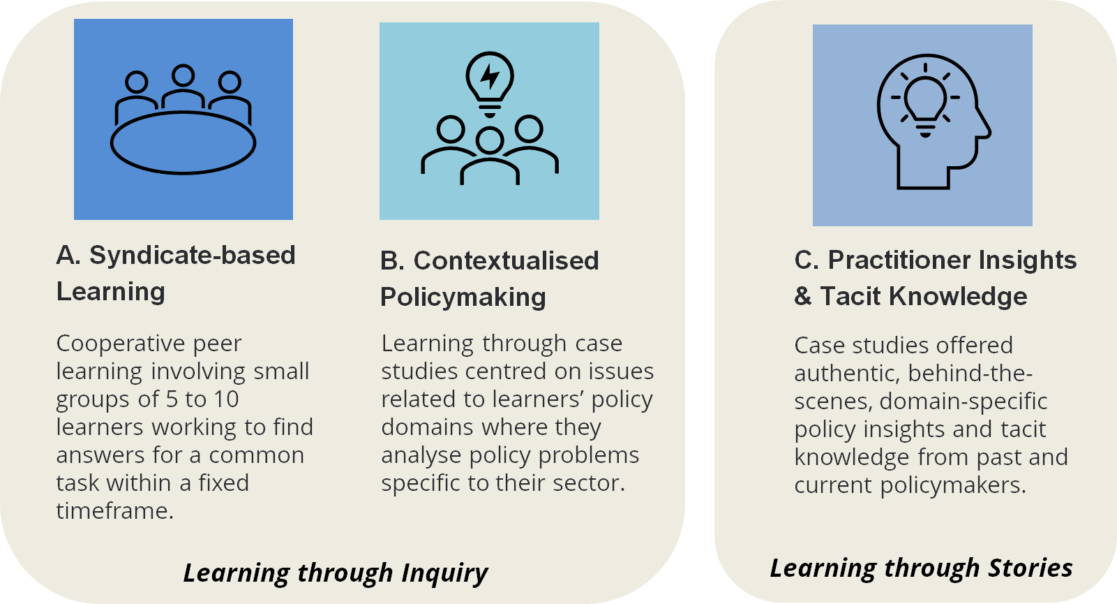 These three themes are connected by two instructional strategies — learning through inquiry and learning through practitioner stories. The former lets policymakers develop critical thinking skills, while the latter develops policy domain knowledge and policy sensibilities. Both are essential competencies for policymakers to integrate policy theories with practitioner experience.