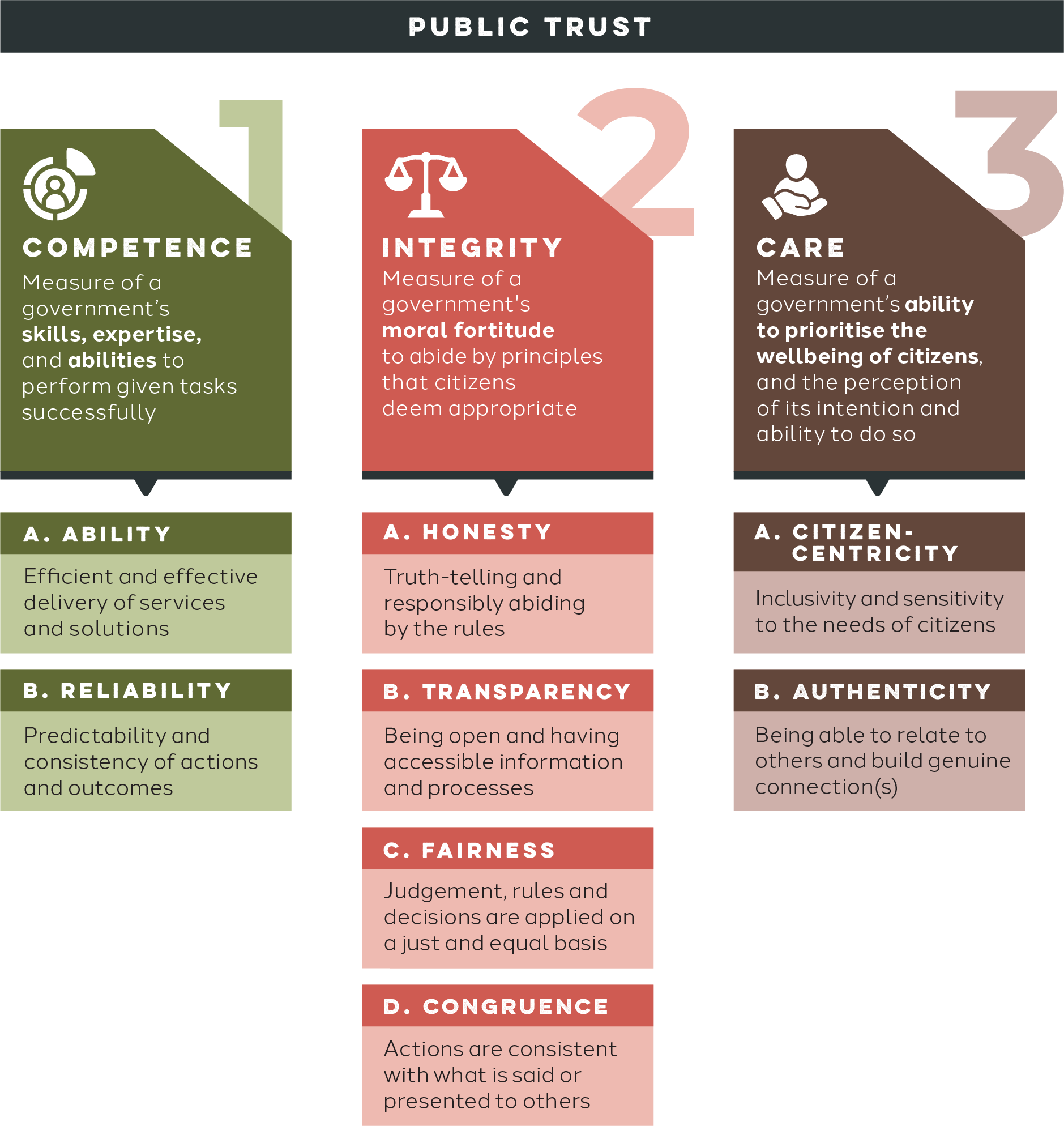 Trust can be a nebulous concept and may mean different things to different people. Research12 suggests that there are three key components to public trust: competence, integrity, and care.