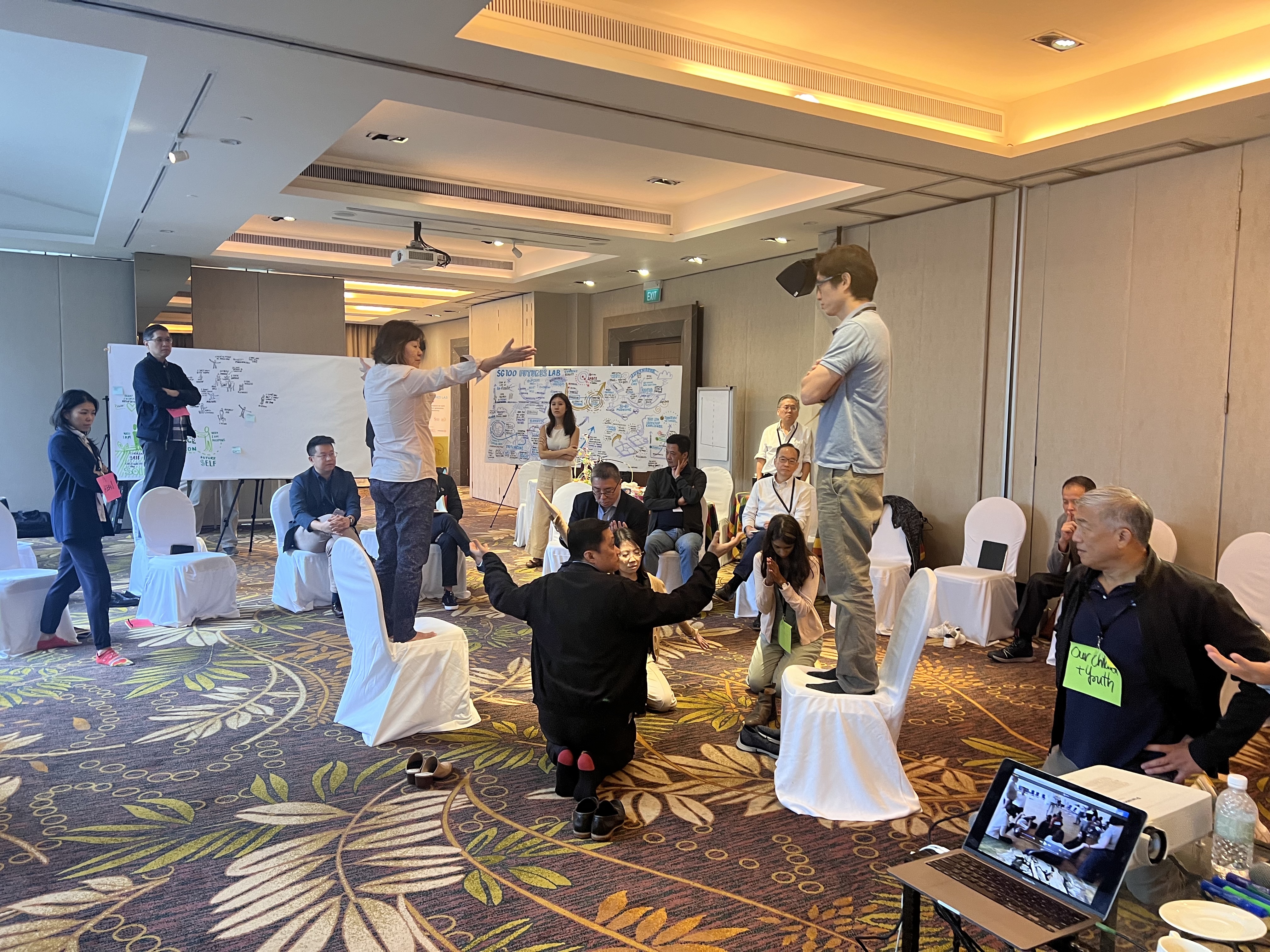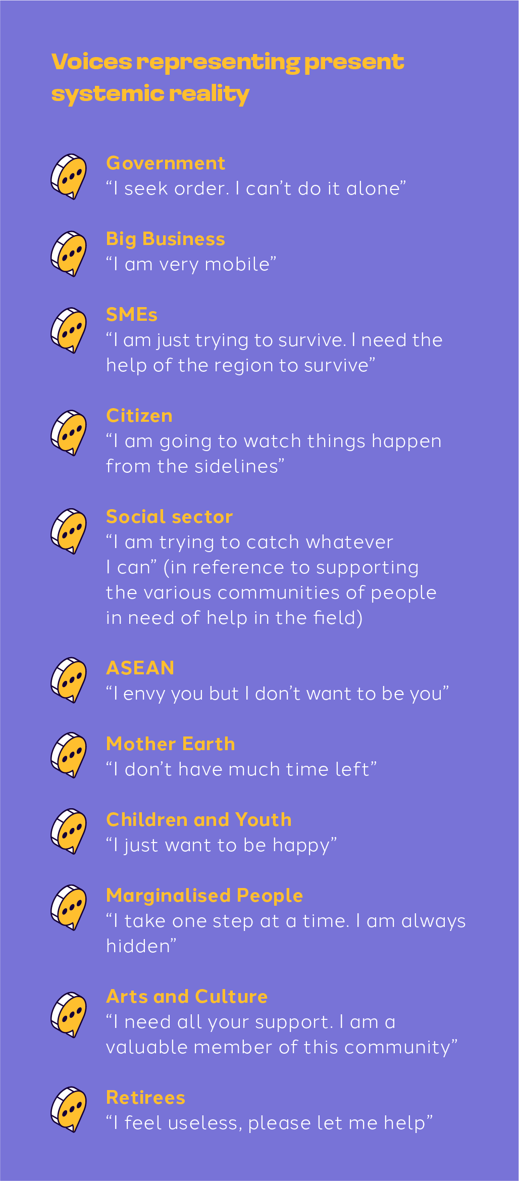 A total of 13 roles were defined for this 4D mapping: Mother Earth, ASEAN, China, US, Singapore Government, Big Businesses, SMEs, Social Sector, Arts and Culture, Children and Youth, Marginalised People, and Retirees. The task was to embody the Vision of Singapore, SG100.