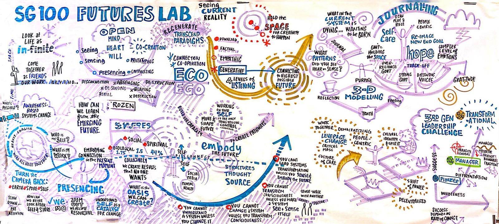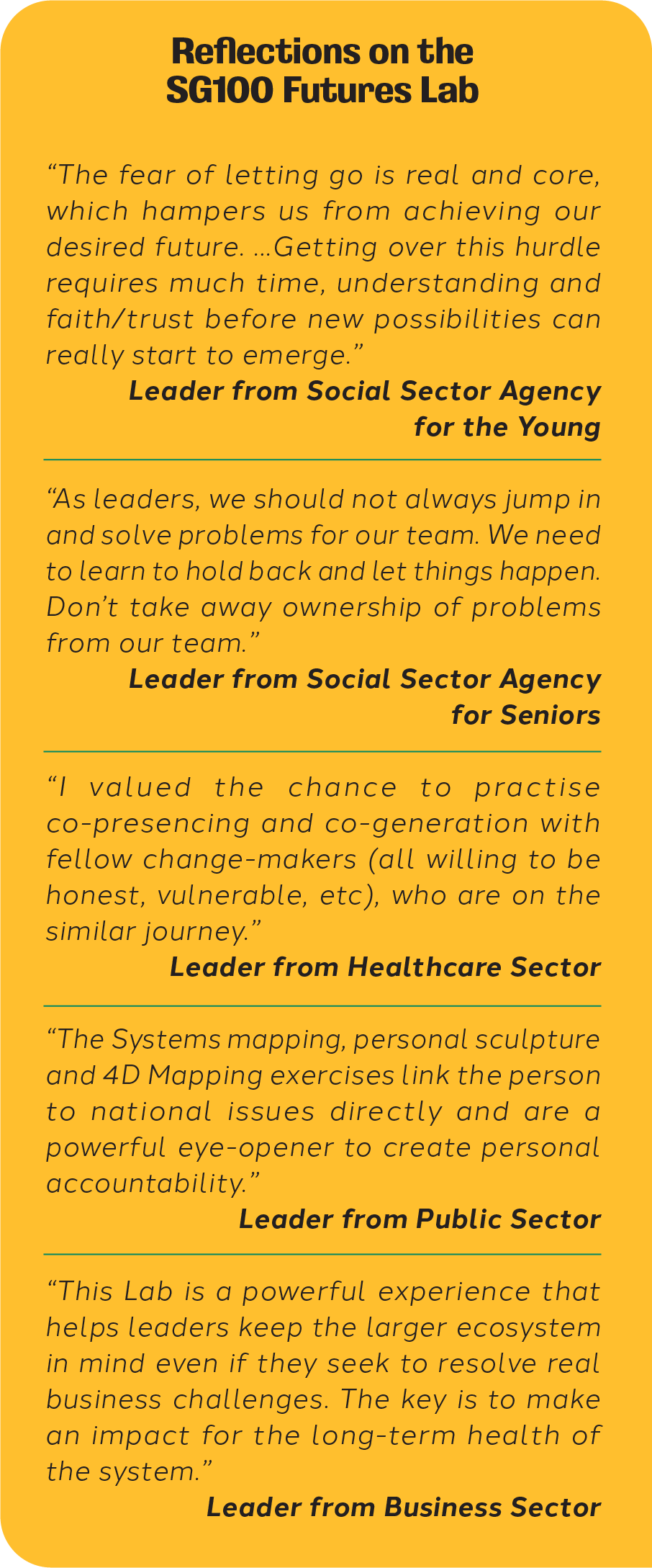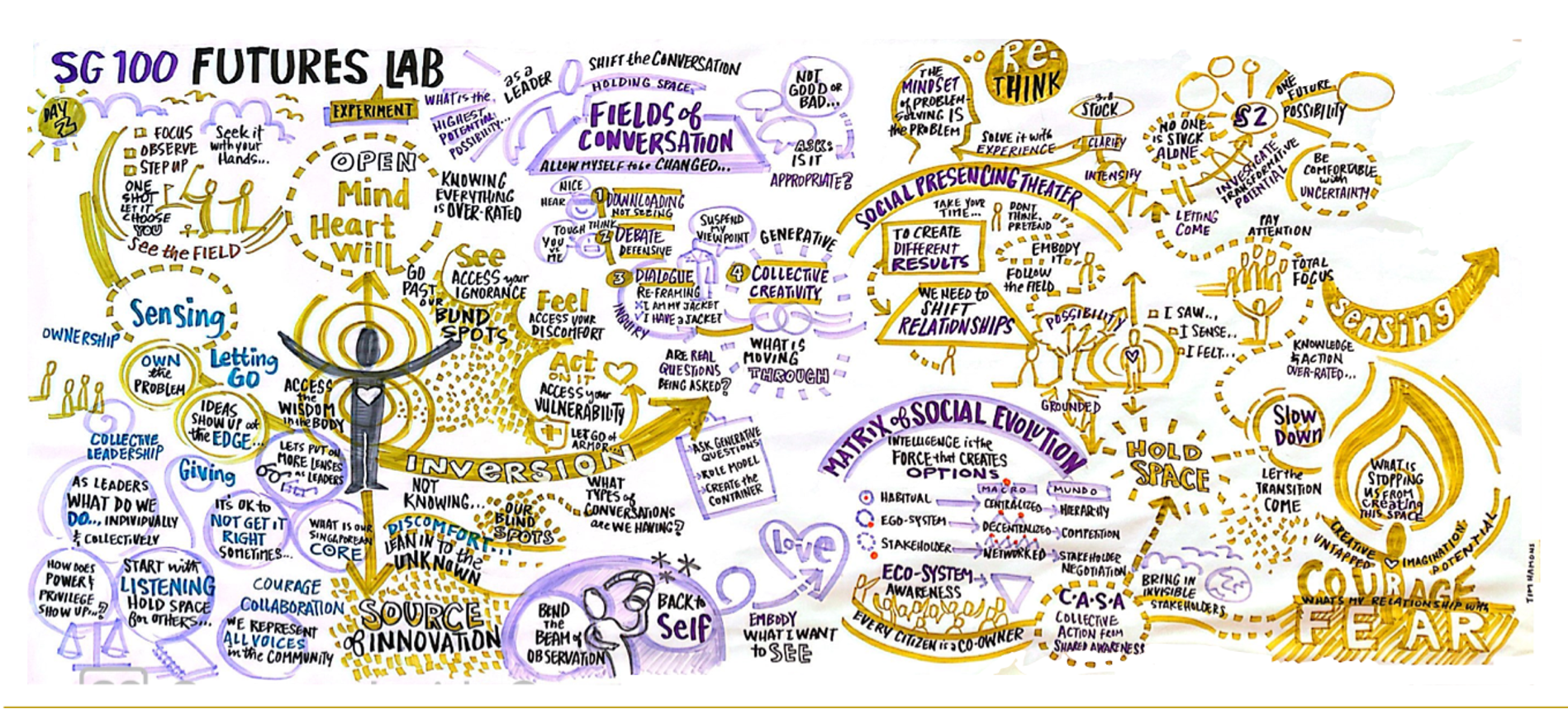 Facilitated jointly by the creator of Theory-U, Otto Scharmer2 and the then Dean of the Centre for Systems Leadership and Managing Director of Sequoia Group, Jacqueline Wong, the SG100 Futures Lab3 was born of an initiative by a nucleus group of senior leaders from across Singapore's 3P sectors coming together,4 on their own accord, out of a concern for the shortage of platforms for convening systems leadership dialogues. The idea was to create a space for envisioning the desired future we want to create for Singapore for SG100.