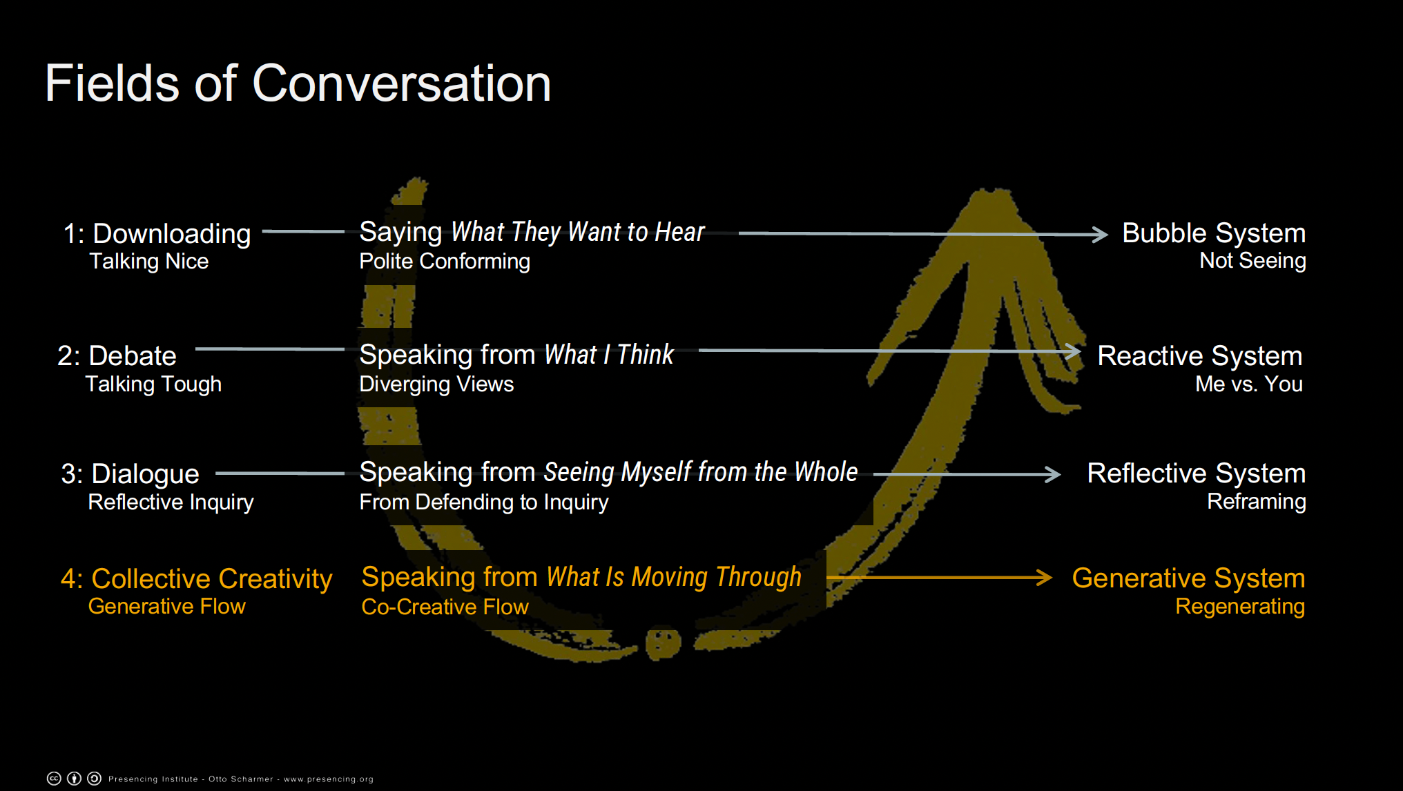To deepen the practice of speaking and seeing themselves from the whole, the participants also experimented with 4D Systems Mapping. Using an embodiment method from Social Presencing Theatre (SPT),8 group members physically embodied roles within a system and—through relational positioning, movement and spoken expression with these roles—made visible the system's current reality and emergent potential.