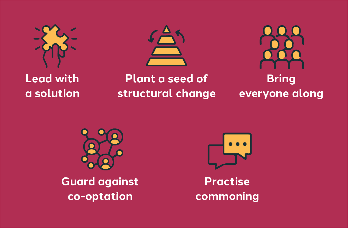 Non-profit organisations running programmes might well engage in community building and not commoning. Charities face pressure from funders and stakeholders to monetise their knowhow as proprietary knowledge so that they can receive grants for further runs of their programmes, or charge licensing or consultancy fees to others who want to learn from them. Indeed, Policy Lab had originally budgeted for training and consultancy fees for the UK organisation running 'Community Circles',16 assuming we would have to pay them to teach us. When we looked more carefully at their website, we found comprehensive 'do-it-yourself' kits and modular training videos enabling us to equip ourselves to run Community Circles. Making everything publicly available at no cost is their business model—and one considered foolish in a service provision paradigm.