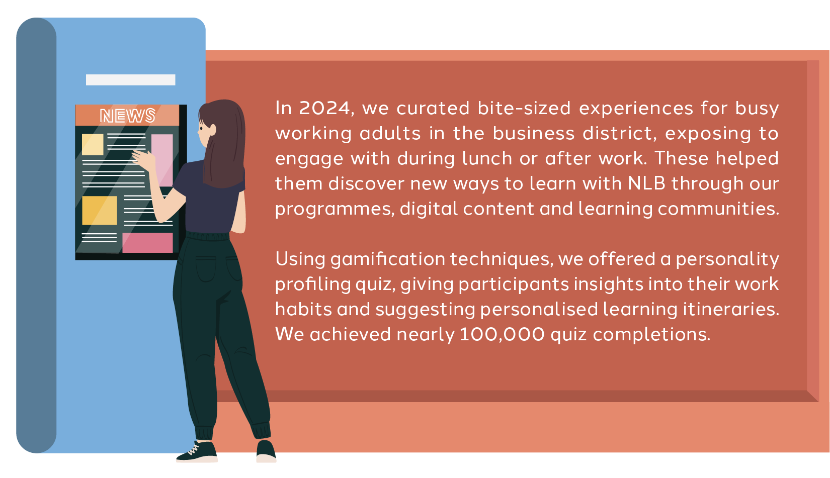 It is now easier for library users to chart their own learning journeys. Through partnerships with the Institutes of Higher Learning, we have also curated tasters of SkillsFuture-funded programmes, enabling adults to learn practical knowledge and skills in under two hours, while signposting further learning opportunities with our institutional partners.