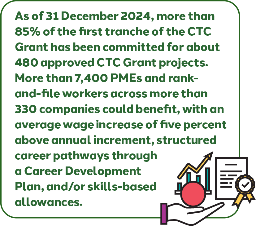 Companies can also drive business and workforce transformation by leveraging the CTC Grant and the Operation and Technology Roadmap. The CTC Grant, administered by NTUC's Employment and Employability Institute (e2i), is funded from the $300 million set aside by the Government to scale up NTUC's CTC initative. To help enhance business capabilities and worker outcomes, it funds up to 70 per cent of the qualifying cost for companies' transformation projects or training tied to a transformation project.