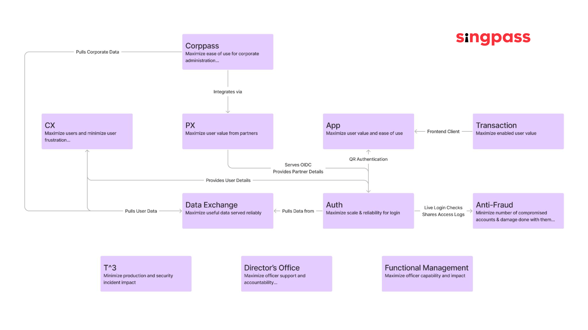 In developing Singpass, we previously had a lot of Rube Goldberg problems. Even minor launches required coordination from at least six different groups and dozens of people. To address this, we restructured to group people around each product with a clear goal and explicitly mapped out the main ways the different teams depended on each other. For example, the authentication team had the goal ‘Maximise scale and reliability of logins’, while the customer experience team’s goal was to ‘Minimise user frustration’. Each new team was cross-functional (design, frontend, backend, operations). This meant that most of the work could happen within each team, only occasionally requiring cross team collaboration.